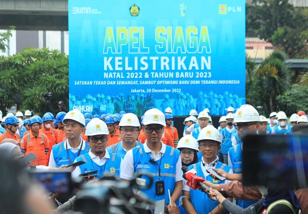 Direktur Utama PLN, Darmawan Prasodjo (tengah), didampingi jajaran Direksi dan Direktur Utama Subholding PLN, saat memberikan keterangan kepada awak media pada saat Apel Siaga Kelistrikan Natal 2022 dan Tahun Baru 2023 di Kantor Pusat PLN. Media massa menjadi mitra PLN dalam memberikan informasi kepada publik. FOTO DOK PLN