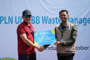 | Hadi dari Biomagg (kanan) menyerahkan secara simbolis pengelolaan sampah organik kepada PLN UIT JBB yang diterima oleh Erwin Ansori GM UIT JBB. FOTO DOK PLN |