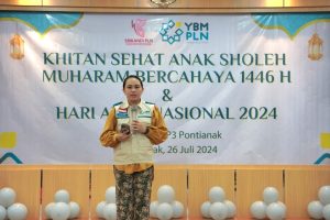 | General Manager PLN UID Kalimantan Barat, Joice Lanny Wantania memberikan sambutan pada acara “Khitan Sehat Anak Sholeh, Muharam Bercahaya 1446 H & Hari Anak Nasional” (26/07). FOTODOKPLN |